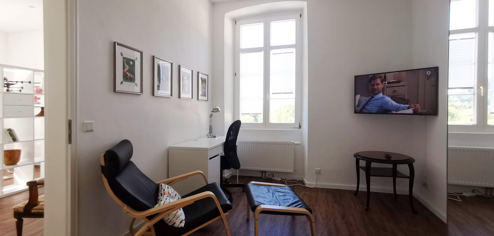 Die Wohnung liegt im Hauptgebäude des Zollhauses und ist gegen Westen und Süden gerichtet. Sie befindet sich im ersten Obergeschoss. Hohe Räume im alten Stil zeichnen diese Wohnung aus. Dank grossen Fenstern mit Blick in die wunderschöne Umgebung ist sie von früh bis spät lichtdurchflutet.