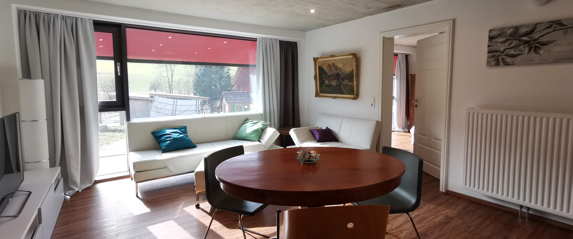 Die Wohnung liegt im Glashaus und ist gegen Süden und Westen gerichtet. Sie befindet sich im ersten Obergeschoss. Dank der bis zum Boden reichenden Fensterfassade mit Blick in die wunderschöne Umgebung ist sie von früh bis spät lichtdurchflutet.